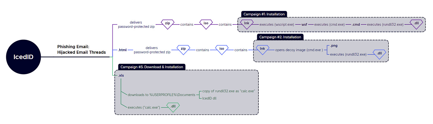 IcedID & Qakbot toy with renamed system binaries and maldocs, but largely continue to rely on zip > iso > lnk detonation to sneak past email filtering;
