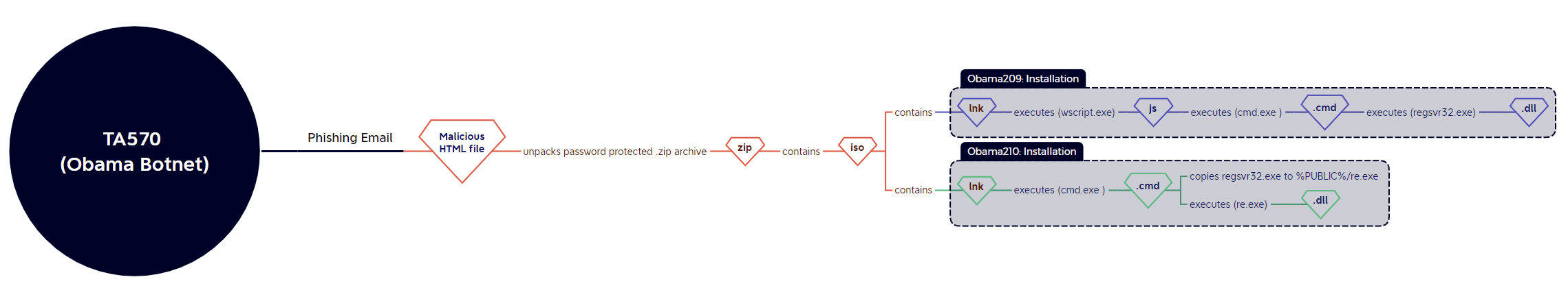 05/10 (Obama209): html > .zip > .iso > cmd.exe (.lnk) > wscript.exe (.js) > cmd.exe (.cmd) > regsvr32.exe (.dll)