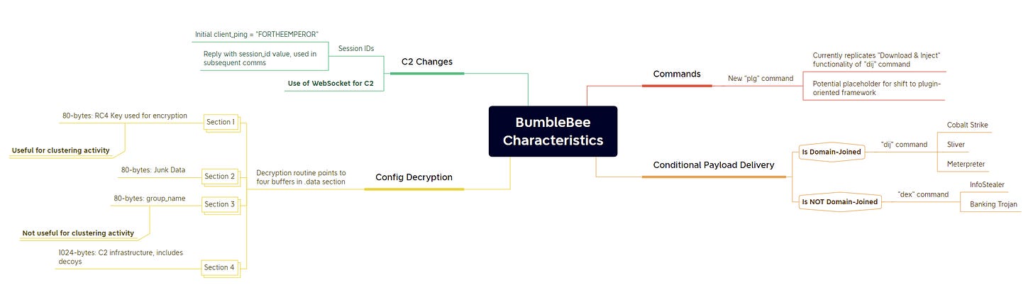 The switch to WebSocket to replace HTTPS as their C2 medium of choice. WebSocket retains the ability to wrap comms in TLS while also being full-duplex, as opposed to HTTPS which is half-duplex. This could allow the devs to configure BumbleBee to be instructed to run tasks as needed, instead of the malware having to repeatedly check in with the C2 at fixed intervals to request new tasking.