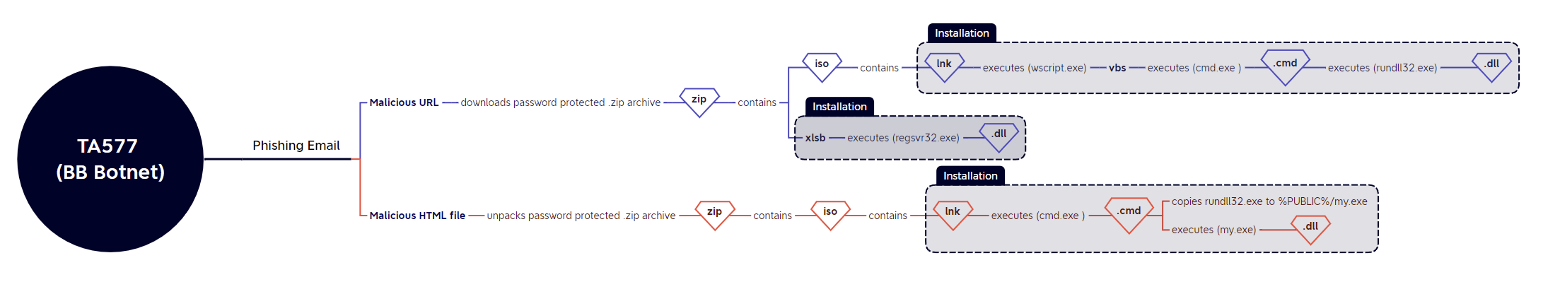 Password Protected ZIP -> ISO -> LNK -> JS -> [CMD or BAT] -> DLL;